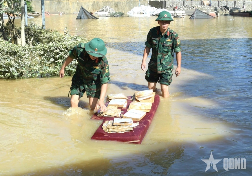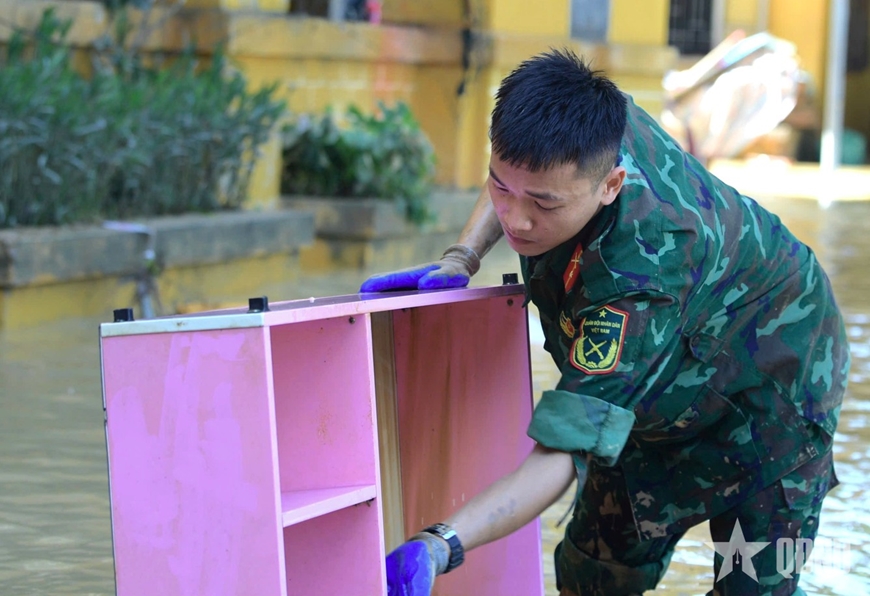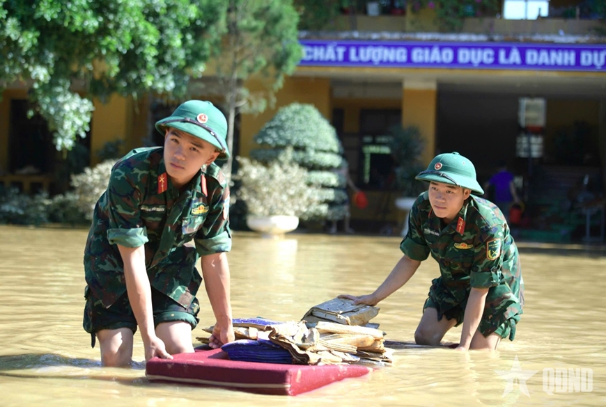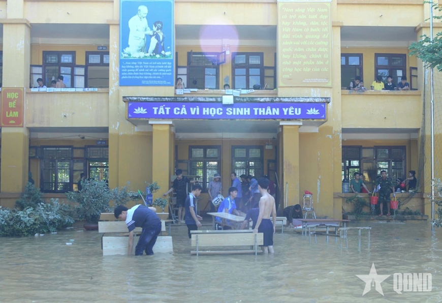 Trung tá Nguyễn Sĩ Phương, Phó chính ủy Trung đoàn 12 (Sư đoàn 3, Quân khu 1) cho biết: “Do nước ngập hết tầng 1 của trường, từ ngày 9-10, đơn vị đã cử 100 cán bộ, chiến sĩ bơi qua vùng nước ngập, tiếp cận và cứu trợ nhu yếu phẩm cho các thầy cô giáo và các em học sinh. Đến sáng 10-10, nước có dấu hiệu rút, trung đoàn tổ chức lực lượng, phương tiện đến tổng dọn vệ sinh để các em sớm ổn định, học tập trở lại".