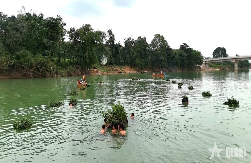 Cán bộ, chiến sĩ Tiểu đoàn 4 và các phân đội hỏa lực thuộc Trung đoàn 19, Sư đoàn 968 tổ chức vượt sông trong diễn tập.