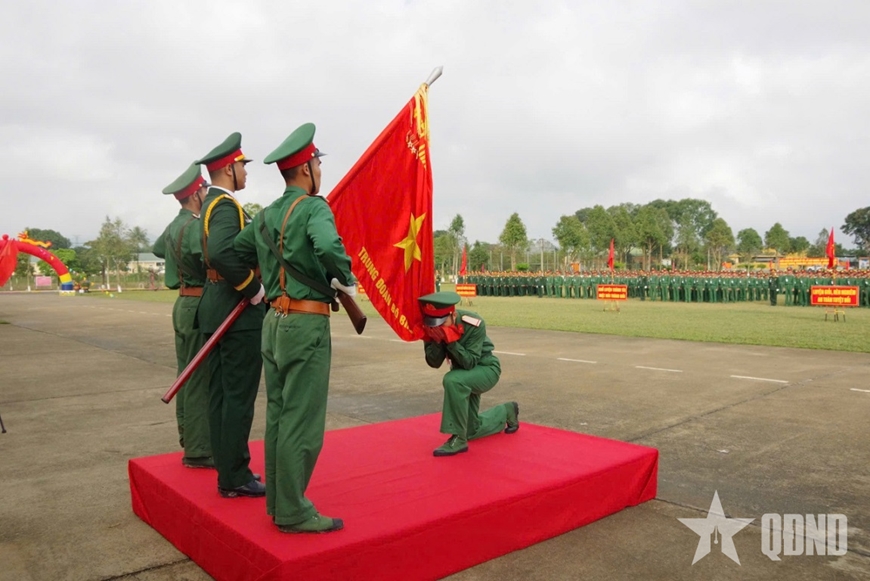 | Chiến sĩ xuất ngũ năm 2026 của Trung đoàn 19 thực hiện nghi thức hôn Quân kỳ. |