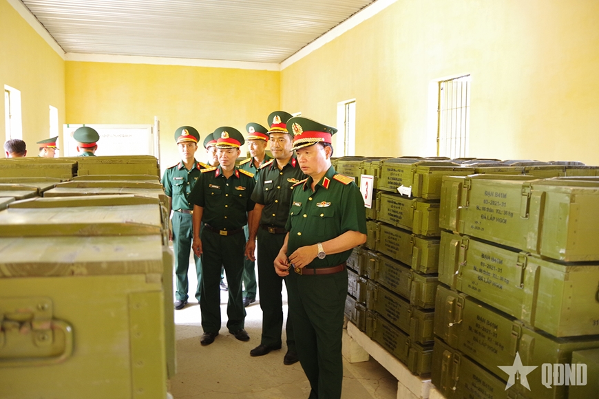 | Đoàn công tác kiểm tra công tác quản lý, bảo quản vũ khí, trang bị kỹ thuật tại kho của Trung đoàn 3. |