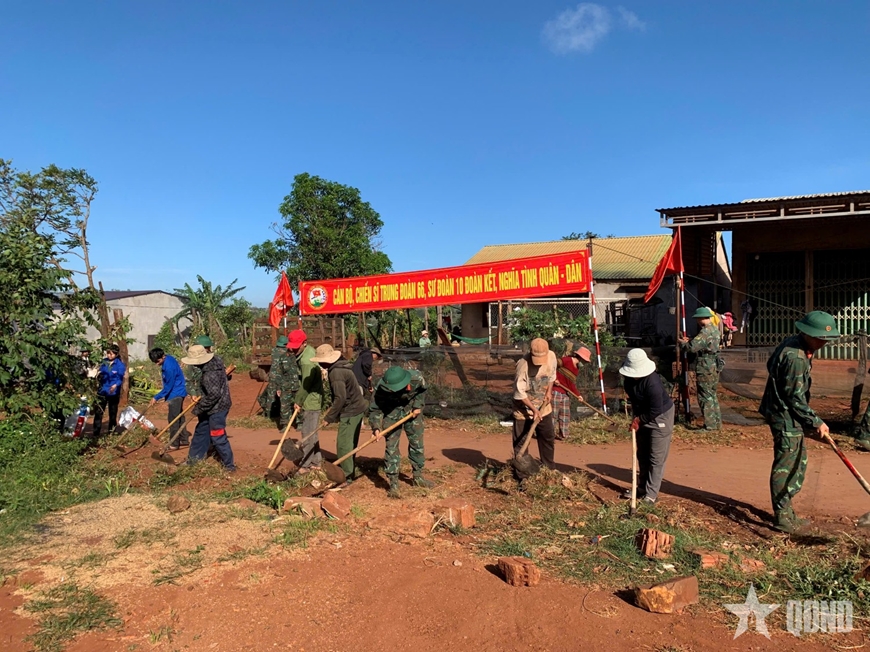 | Cán bộ, chiến sĩ Trung đoàn 66 giúp nhân dân thôn 2B, xã Ea H’leo, tỉnh Đắk Lắk đổ đường bê tông. |