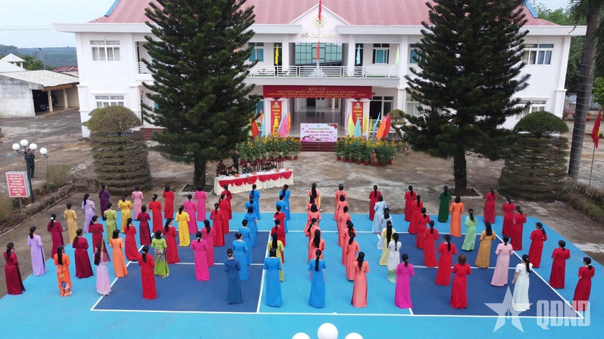 Phụ nữ Trung đoàn 719, Binh đoàn 16 tham gia đồng diễn dân vũ chào mừng Ngày Quốc tế Phụ nữ 8-3.