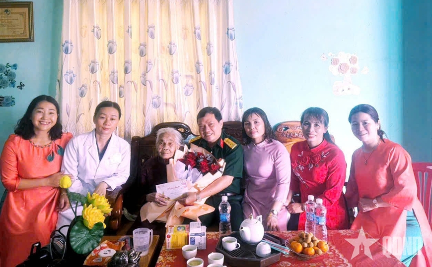 | Thượng tá Vũ Văn Lương, Bí thư đảng ủy, Chính ủy Trung đoàn 719 cùng cán bộ phụ nữ trung đoàn thăm tặng quà Bà mẹ Việt Nam anh Hùng Trần Thị Bảy. |