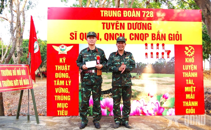 Đại tá Phạm Văn Nghĩa, Trung đoàn trưởng Trung đoàn 728 tặng hoa cá nhân bắn giỏi.
