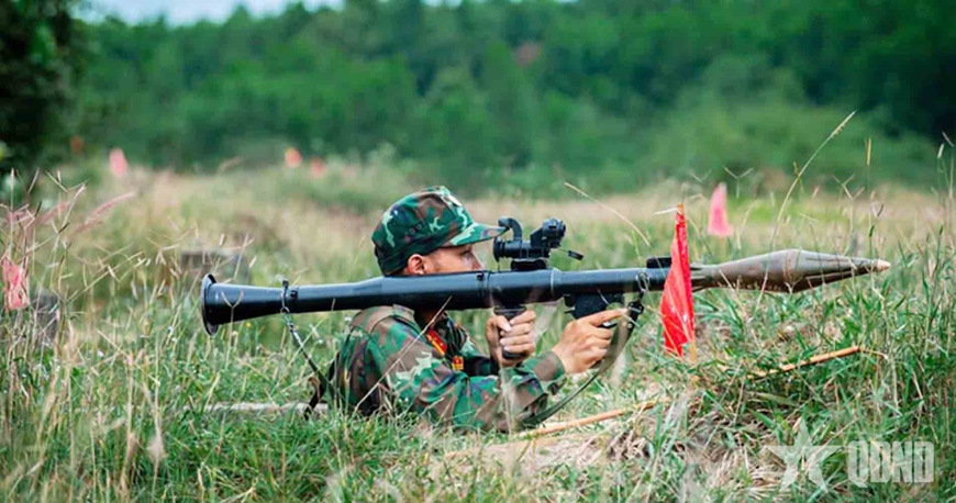 Xạ thủ B41 thực hành tiêu diệt mục tiêu trong diễn tập.