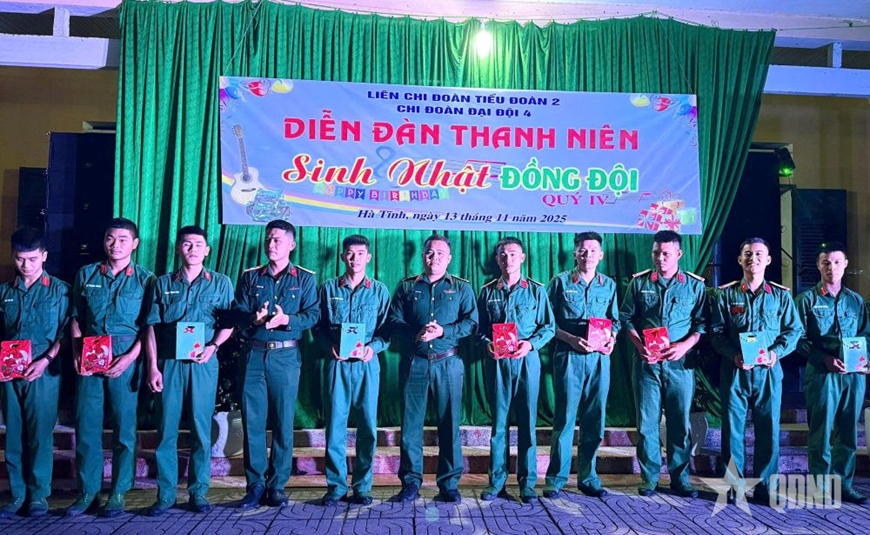 Trung úy Nguyễn Đức Quý - MC xuất hiện trong những tràng pháo tay của hàng trăm đoàn viên. Sau lời tuyên bố lý do, giới thiệu đại biểu, “nhân vật chính” - 16 đoàn viên là các chiến sĩ của đơn vị có sinh nhật trong dịp này được mời lên sân khấu trong tiếng hò reo, cổ vũ “đậm chất lính” của đồng chí, đồng đội.