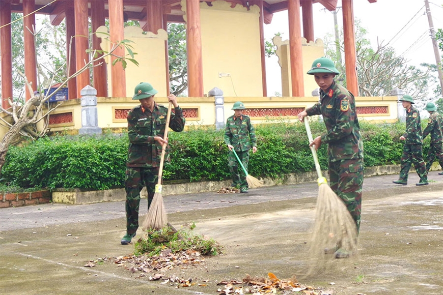 | Chiến sĩ Trung đoàn 841 giúp địa phương vệ sinh môi trường. |