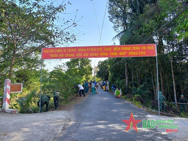 Cán bộ, chiến sĩ Trung đoàn 9 giúp nhân dân dọn vệ sinh môi trường.