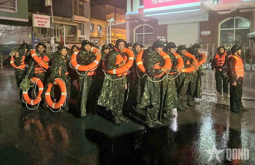 | Cán bộ, chiến sĩ đơn vị vượt lũ, cơ động ngay trong đêm để đến với người dân cần hỗ trợ. |