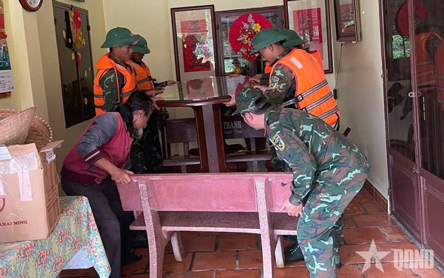 Cán bộ, chiến sĩ Trung đoàn 994B hỗ trợ tháo dỡ các tài sản của người dân ở khu vực có nguy cơ ngập lụt.