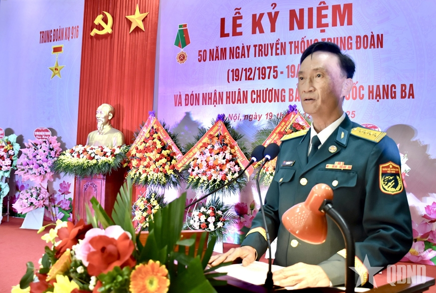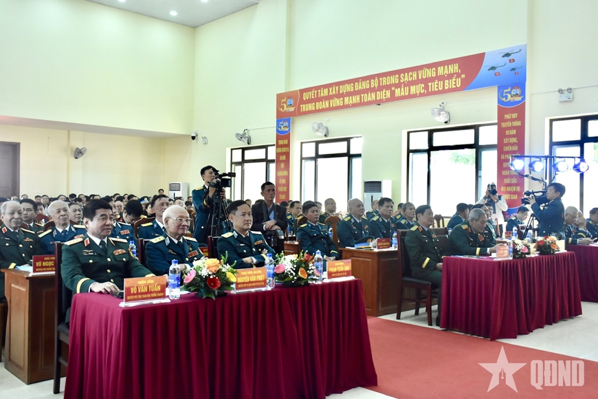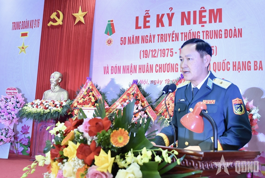 Phát biểu chỉ đạo tại buổi lễ, Thiếu tướng Phạm Tuấn Anh, Phó tư lệnh Quân chủng PK-KQ biểu dương những thành tích của Trung đoàn Không quân 916 đạt được trong 50 năm qua.