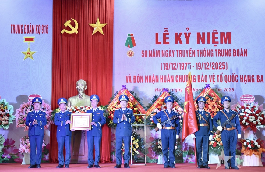 | Trung đoàn Không quân 916 đón nhận Huân chương Bảo vệ Tổ quốc hạng Ba tại buổi lễ. |