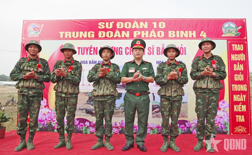 Trung tá Hoàng Chí Công, Phó tham mưu trưởng Sư đoàn 10 trao hoa bắn giỏi cho các chiến sĩ mới của Trung đoàn Pháo binh 4.