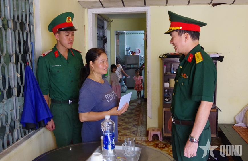 Đại tá Trần Việt Hà, Bí thư Đảng ủy, Chính ủy Trung tâm 386 thăm hỏi, tặng quà gia đình bà Lê Thị Thu, hộ nghèo phường Ngũ Hành Sơn (TP Đà Nẵng).
