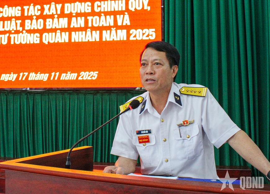 Đại tá Bùi Quốc Kiên, Chỉ huy trưởng Trung tâm Bảo đảm kỹ thuật Vùng 2 Hải quân phát biểu tại hội nghị rút kinh nghiệm.
