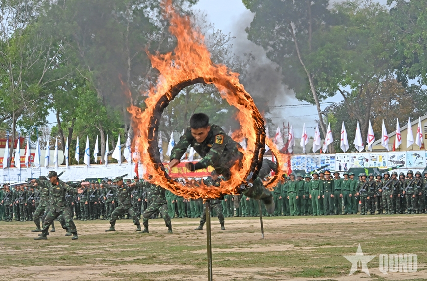 | Chiến sĩ Trung đoàn 28 trình diễn võ thuật tại lễ ra quân huấn luyện. |