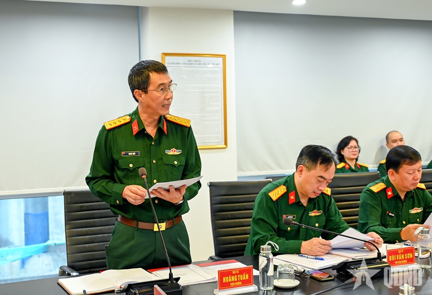 | Đại tá Hoàng Tuấn, Viện trưởng Viện Thiết kế (Tổng cục Hậu cần - Kỹ thuật) phát biểu tại buổi làm việc. |
