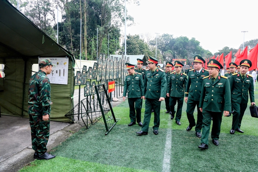 | Thủ trưởng Tổng cục Công nghiệp Quốc phòng và các đại biểu kiểm tra cơ sở vật chất phục vụ huấn luyện. |
