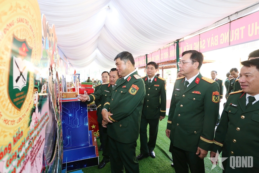 | Lãnh đạo Quân khu 7, nhà trường tham quan các mô hình, sáng kiến tại buổi lễ. |