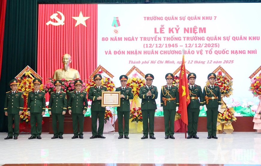 Tại buổi lễ, Trường Quân sự Quân khu 7 vinh dự đón nhận Huân chương Bảo vệ Tổ quốc hạng Nhì với những thành tích tiêu biểu, nổi bật trong giai đoạn 2020-2025.