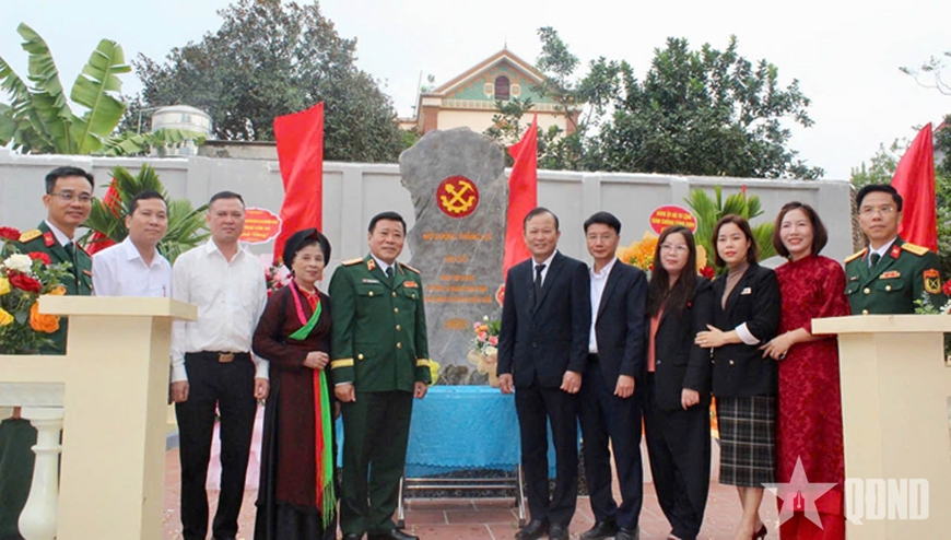 | Các đại biểu chụp ảnh lưu niệm tại Lễ khánh thành công trình Văn bia truyền thống Trường Sĩ quan Công binh. |
