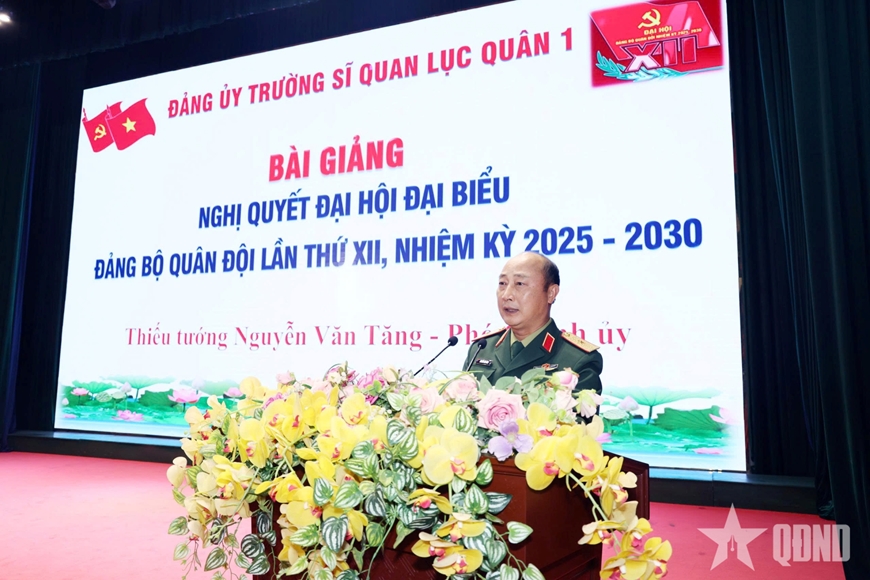 Thiếu tướng Nguyễn Văn Tăng, Phó chính ủy Trường Sĩ quan Lục quân 1 quán triệt nội dung Nghị quyết Đại hội đại biểu Đảng bộ Quân đội lần thứ XII, nhiệm kỳ 2025-2030.