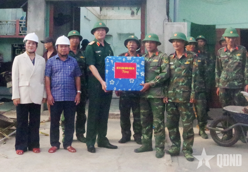 | Trung tướng Đào Tuấn Anh, Tư lệnh Quân đoàn 34 trao quà tặng cán bộ, chiến sĩ Sư đoàn 31 đang giúp nhân dân xã Tuy Phước Đông, tỉnh Gia Lai. |