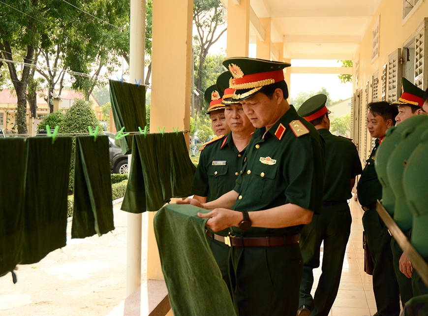 Trung tướng Đào Tuấn Anh kiểm tra chỗ ăn nghỉ của chiến sĩ mới tại Trung tâm giáo dục quốc phòng và an ninh Trường Quân sự Quân đoàn 34 (Cơ sở 2).