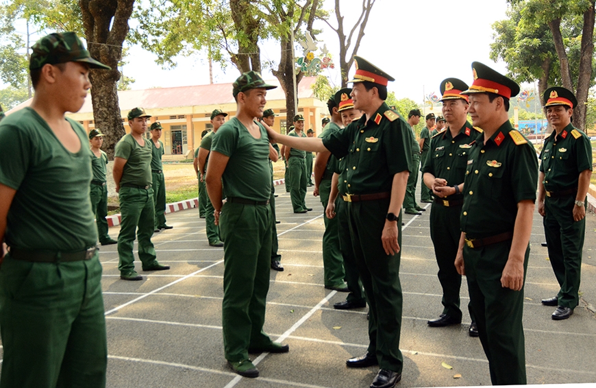 | Trung tướng Đào Tuấn Anh thăm hỏi, động viên chiến sĩ mới tại Trung tâm giáo dục quốc phòng và an ninh. |
