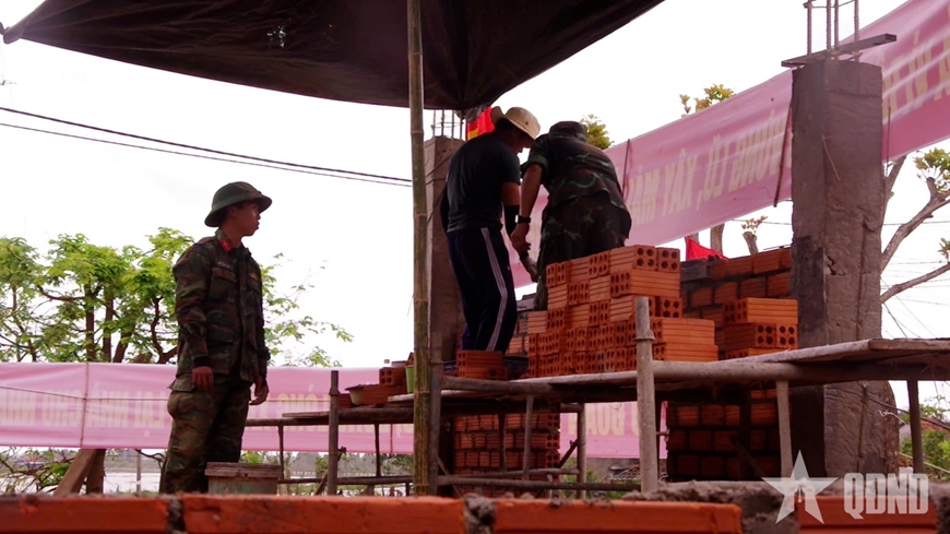| Lữ đoàn 572 (Quân khu 5) thi công nhà cho hộ ông Bùi Xuân Hiến ở xã Hòa Xuân. |