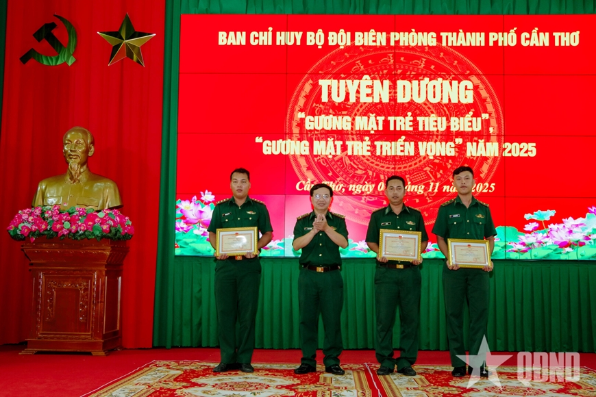 Trao giấy khen tặng các cá nhân đạt danh hiệu Gương mặt trẻ tiêu biểu và Gương mặt trẻ triển vọng trong BĐBP TP Cần Thơ.