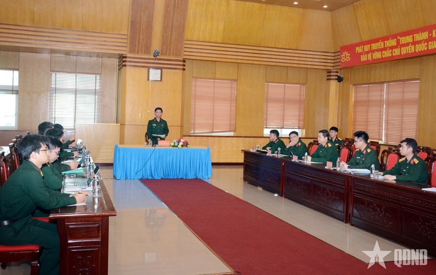 Đại tá Đỗ Tuấn Anh, Phó chủ nhiệm Chính trị Bộ tư lệnh 86 báo cáo kết quả tham gia giải thưởng tại buổi khảo sát.