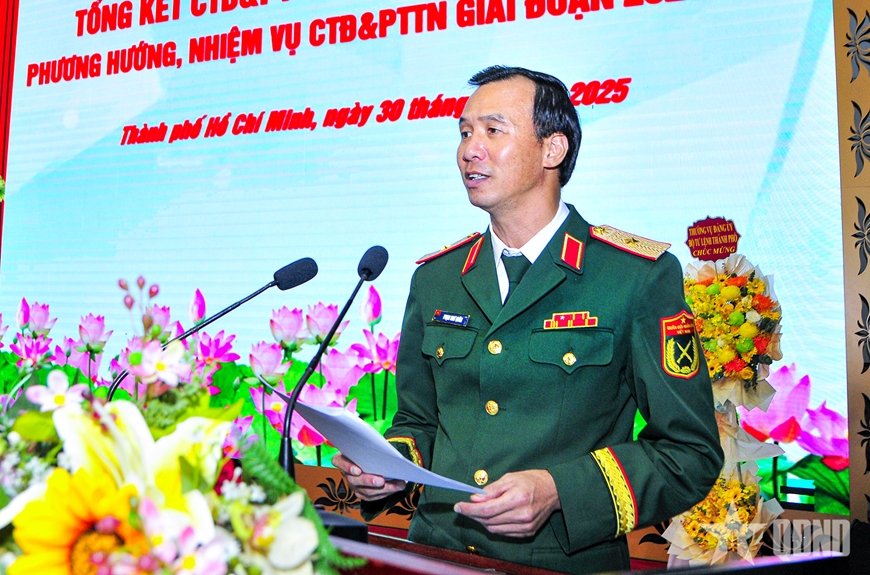Thiếu tướng Phạm Như Quân, Phó chính ủy Bộ tư lệnh TP Hồ Chí Minh phát biểu tại hội nghị.