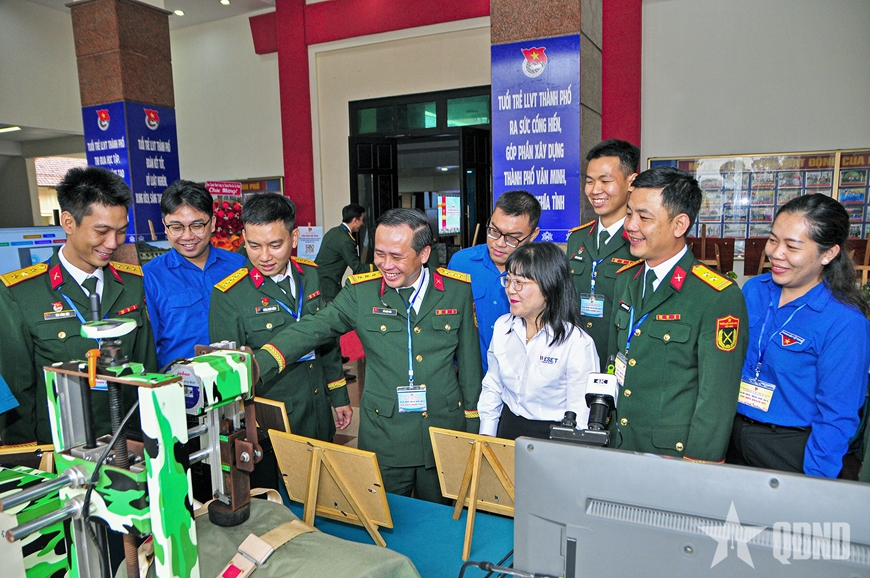 | Các đại biểu tham quan mô hình sáng kiến, cải tiến của đoàn viên, thanh niên LLVT Thành phố. |