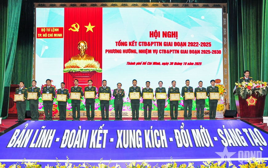 | Thủ trưởng Bộ tư lệnh TP Hồ Chí Minh trao giấy khen tặng các cá nhân có thành tích xuất sắc. |