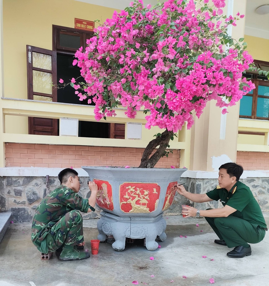 | Sơn sửa, làm mới chậu hoa trong khuôn viên doanh trại. |