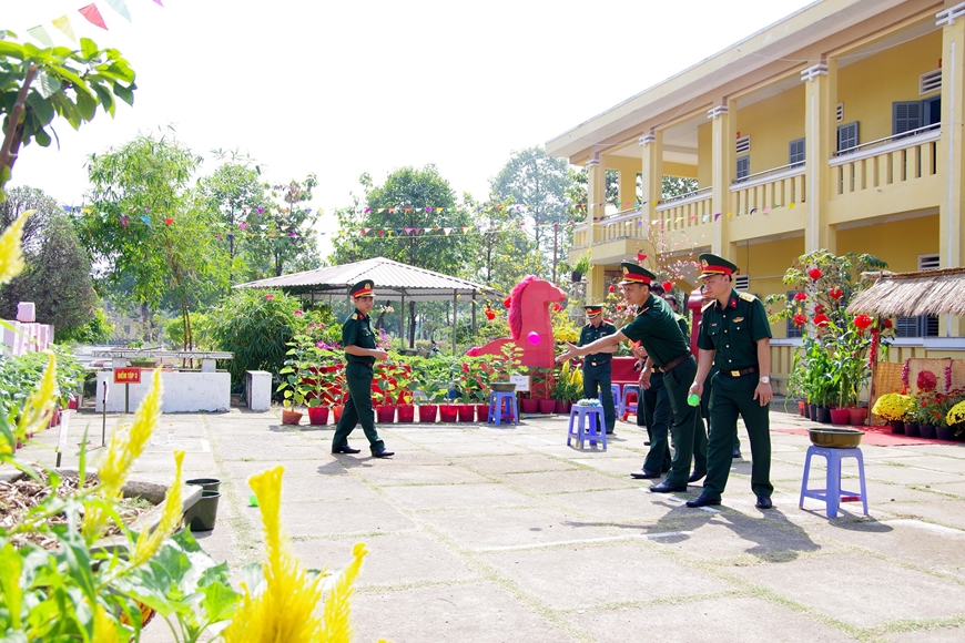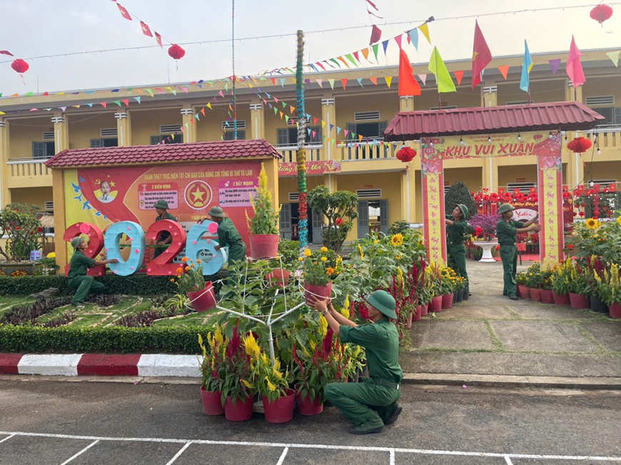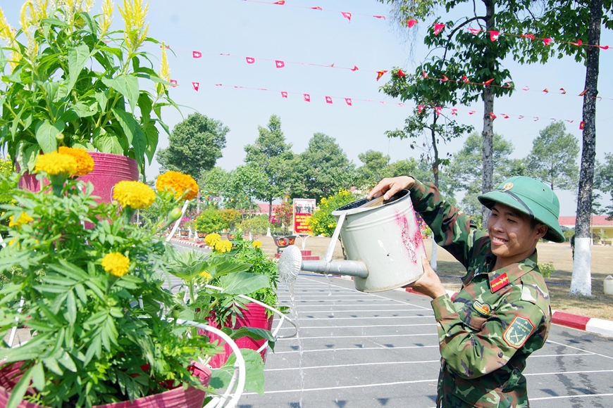 | Cán bộ, chiến sĩ tích cực trang hoàng doanh trại, chuẩn bị tham gia Hội thi vườn hoa xuân, khu vui chơi xuân. |