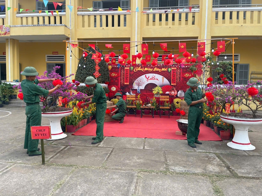 Những ngày giáp Tết, doanh trại rộn ràng sắc xuân, cờ hoa, panô, khẩu hiệu được trang trí mang đậm không khí Tết cổ truyền dân tộc.