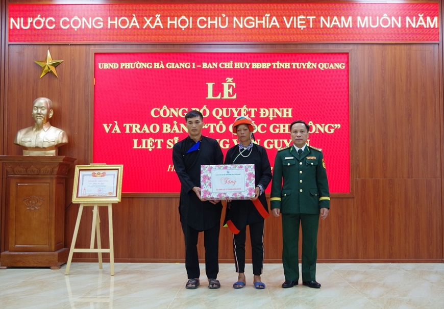 Dự buổi lễ có đại diện Ban Chỉ huy Bộ đội Biên phòng tỉnh Tuyên Quang, cấp ủy chính quyền phường Hà Giang 1; cán bộ, nhân dân thôn Cao Bành và thân nhân gia đình liệt sĩ Cháng Văn Guyện.