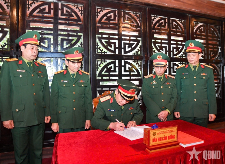 Thay mặt đoàn công tác, Thiếu tướng Lê Văn Thuận ghi sổ cảm tưởng và trao quà của Văn phòng Quân ủy Trung ương - Văn phòng Bộ Quốc phòng tặng Ban quản lý Khu di tích quốc gia đặc biệt ATK Định Hóa.