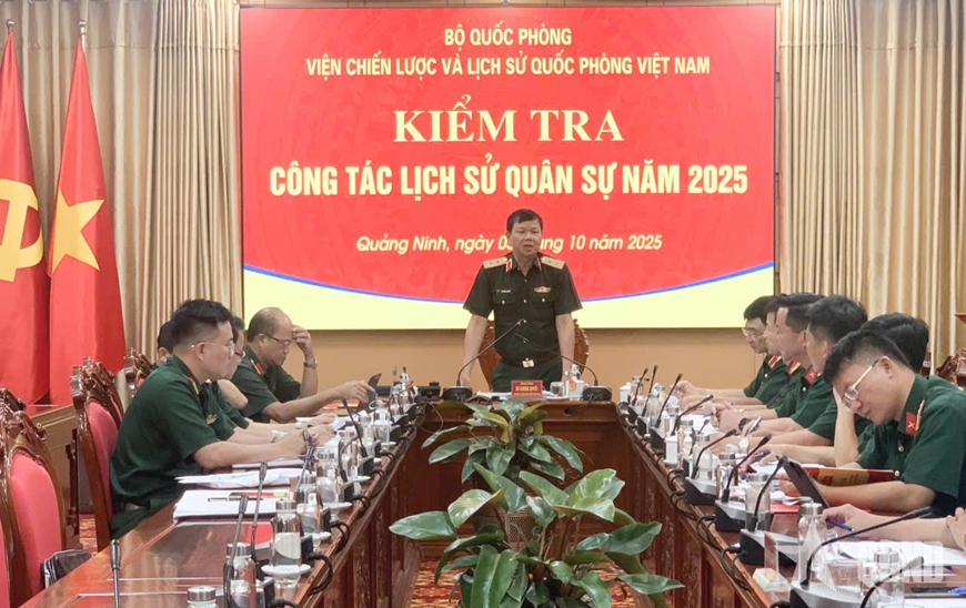 Trung tướng Vũ Cương Quyết, Viện trưởng Viện Chiến lược và Lịch sử quốc phòng Việt Nam phát biểu tại buổi kiểm tra. |