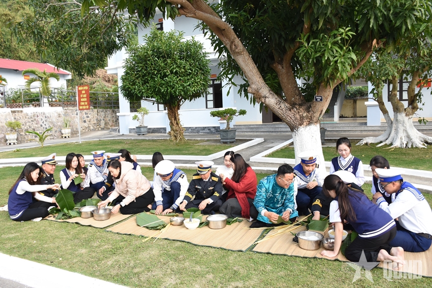 | Đoàn công tác cùng tham gia gói bánh chưng với cán bộ, chiến sĩ Trạm radar 495 và nhân dân đặc khu Cát Hải. |