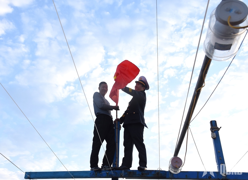 | Cán bộ Vùng 1 Hải quân cùng ngư dân treo cờ Tổ quốc. |