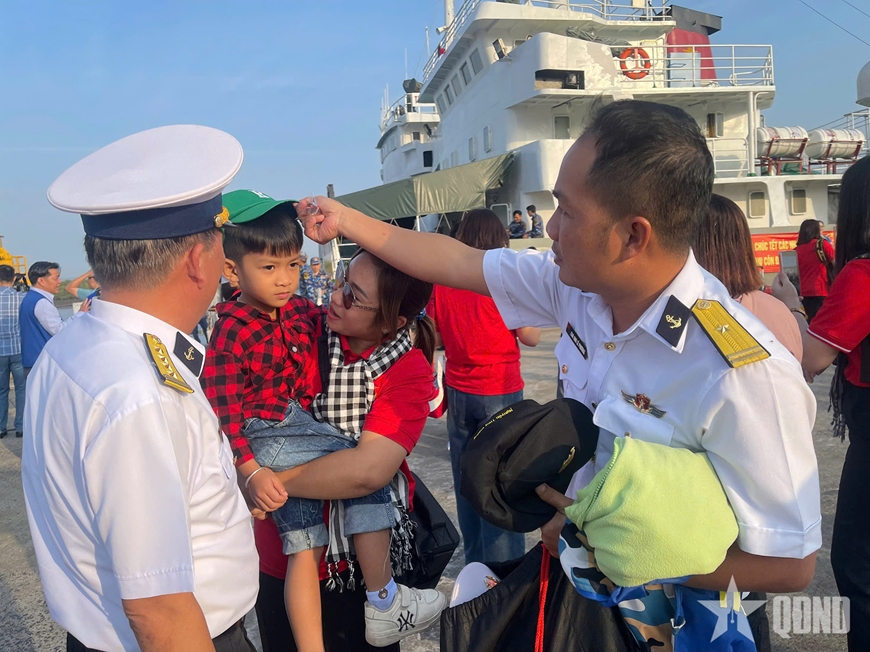 | Thiếu tá Lê Phương Cao Anh (bên phải), giáo viên Trung tâm huấn luyện Vùng 2 Hải quân tiễn vợ là chị Nguyễn Thị Thùy Dương, thành viên Hội Biển, đảo Việt Nam tham gia tàu công tác số 2. |