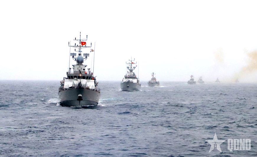 Các biên đội tàu thuộc Vùng 3 Hải quân vận động đội hình thực hiện bài bắn tiêu diệt mục tiêu trên không.