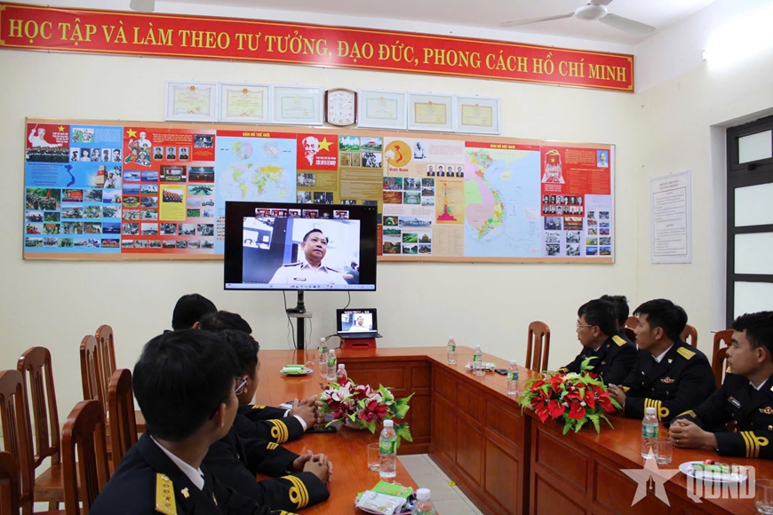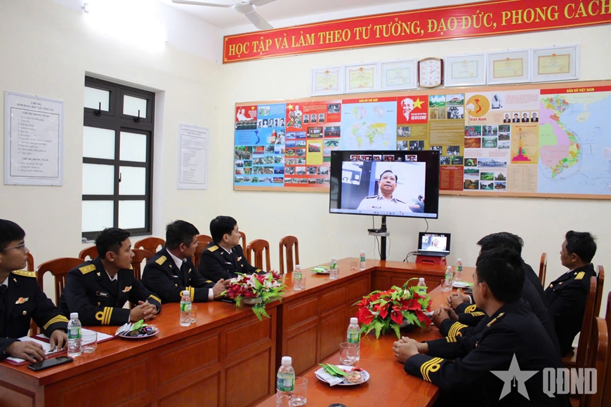 Cán bộ, chiến sĩ Trạm ra-đa 540, Trung đoàn 351 nghe thủ trưởng Bộ tư lệnh Vùng 3 Hải quân chúc Tết trực tuyến. |