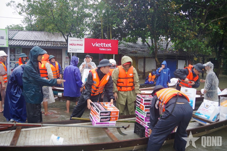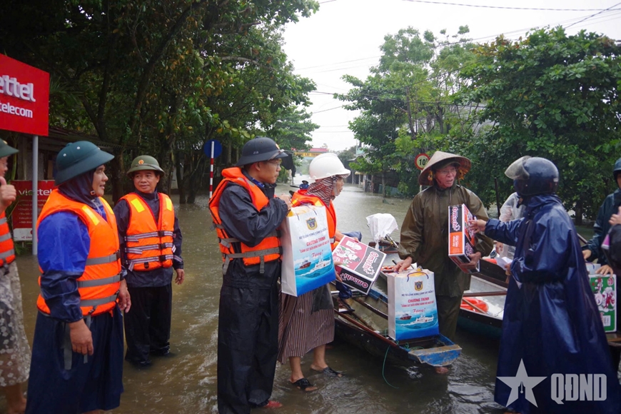 Các cán bộ, chiến sĩ trao nhu yếu phẩm thiết yếu hỗ trợ nhân dân vùng lũ lụt xã Đan Điền, TP Huế.