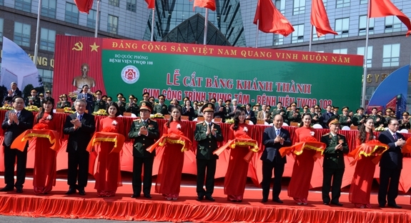 Các đồng chí lãnh đạo Đảng, Nhà nước và các đại biểu cắt băng khánh thành Cụm công trình trung tâm của Bệnh viện TWQĐ 108. |