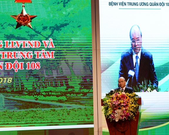 Phát biểu tại buổi lễ, Thủ tướng Nguyễn Xuân Phúc biểu dương cán bộ, y sĩ, bác sĩ của Bệnh viện TWQĐ 108 trong hơn 67 năm xây dựng và trưởng thành, luôn hoàn thành tốt nhiệm vụ chăm sóc, điều trị cho cán bộ, chiến sĩ và nhân dân, đặc biệt là nhiệm vụ chăm sóc bảo vệ sức khỏe cho các đồng chí cán bộ cao cấp của Đảng, Nhà nước, Quân đội. Đội ngũ cán bộ thầy thuốc của Bệnh viện TWQĐ 108 đã làm chủ các trang thiết bị y tế hiện đại, thực hiện thành công, an toàn các kỹ thuật khó, phức tạp, kỹ thuật cao, chuyên sâu, cứu sống được nhiều đồng chí thương binh, bệnh binh nặng và các bệnh nhân mắc bệnh hiểm nghèo; khẳng định chức năng đầu ngành của các chuyên khoa tuyến cuối. Bên cạnh đó, Bệnh viện TWQĐ 108 còn đạt nhiều thành tích xuất sắc trong nghiên cứu khoa học, ứng dụng các tiến bộ khoa học kỹ thuật tiên tiến, hiện đại vào chẩn đoán, cấp cứu và điều trị, có nhiều kỹ thuật đạt trình độ khu vực và quốc tế, trong đó có các kỹ thuật ghép mô, bộ phận cơ thể người. Đặc biệt, đầu năm 2018, bệnh viện đã triển khai thực hiện thành công ca ghép phổi từ người cho chết não đầu tiên ở Việt Nam và tham gia ca ghép đa phủ tạng xuyên Việt (phối hợp giữa Bệnh viện TWQĐ 108 và Bệnh viện Chợ Rẫy), đánh dấu sự trưởng thành vượt bậc về trình độ kỹ thuật và năng lực chuyên môn của các thầy thuốc Bệnh viện - là một dấu son trong lịch sử y học nước nhà.