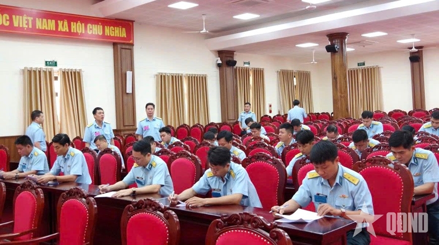| Các thí sinh làm bài trắc nghiệm kiểm tra nhận thức trong phần thi báo cáo viên. |